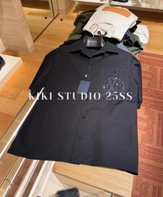 LV 25SS 早春Pharrell菲董设计师秀款 珠片绣花口袋黑色府绸布短袖衬衫