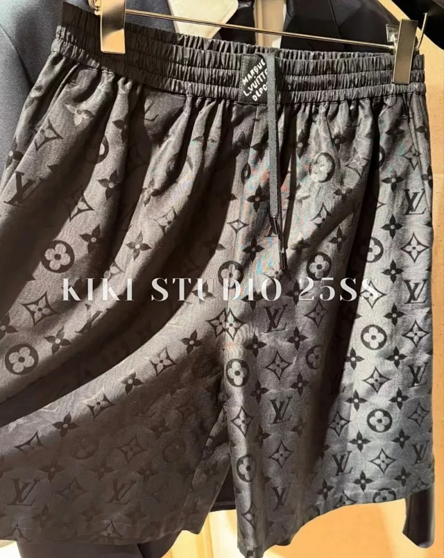 LV 25SS Pharrell菲董秀款腰部标识LOGO刺绣暗纹满印黑色丝绸短裤