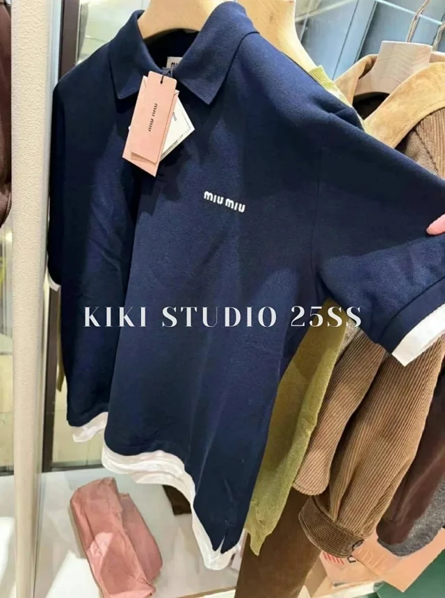 MIU缪 25SS 学院风基础款经典翻领LOGO刺绣藏青色假两件POLO衫短袖T恤