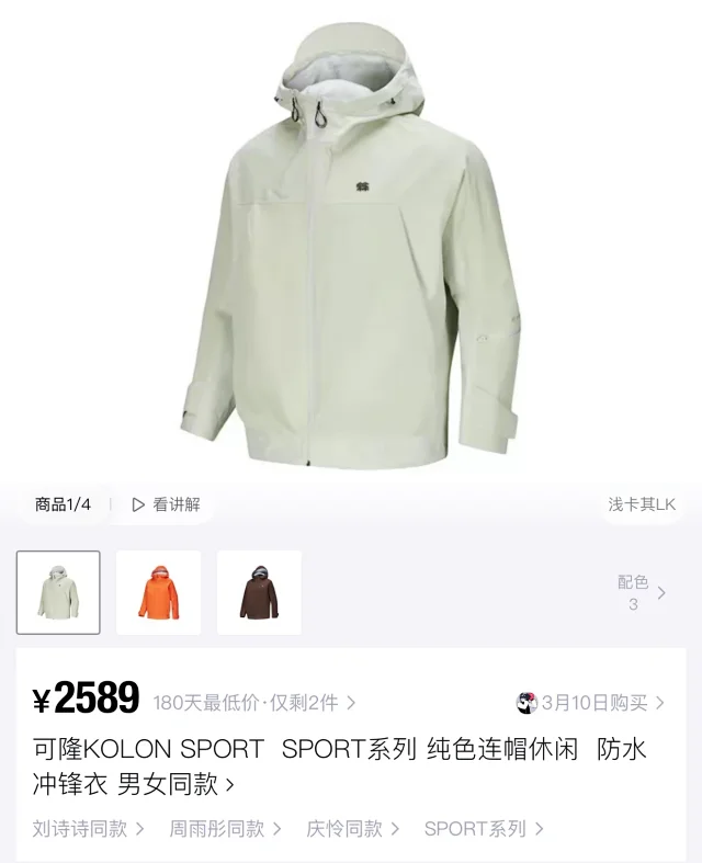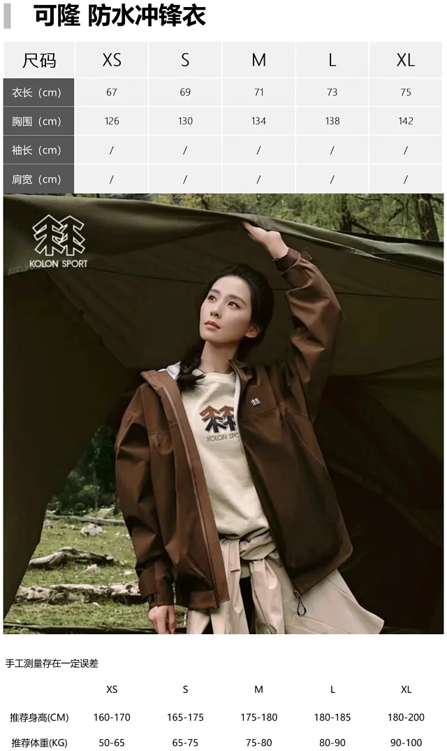 “Kolon可隆Sport系列纯色休闲连帽冲锋衣外套男女同款”