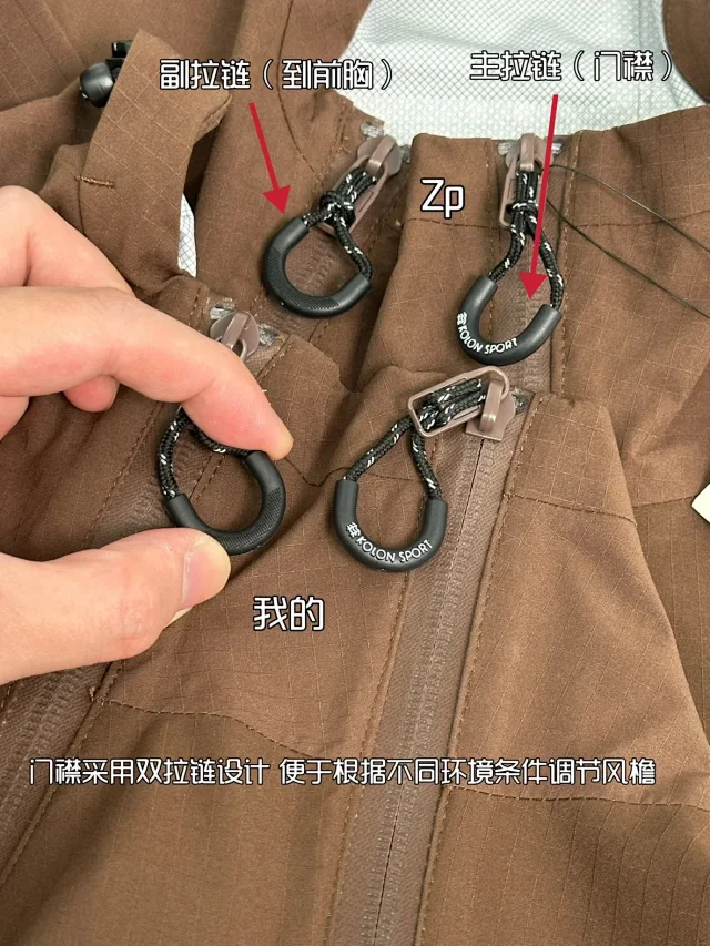 除开门襟主拉链右侧领檐还有一条可以拉至胸前的拉链
